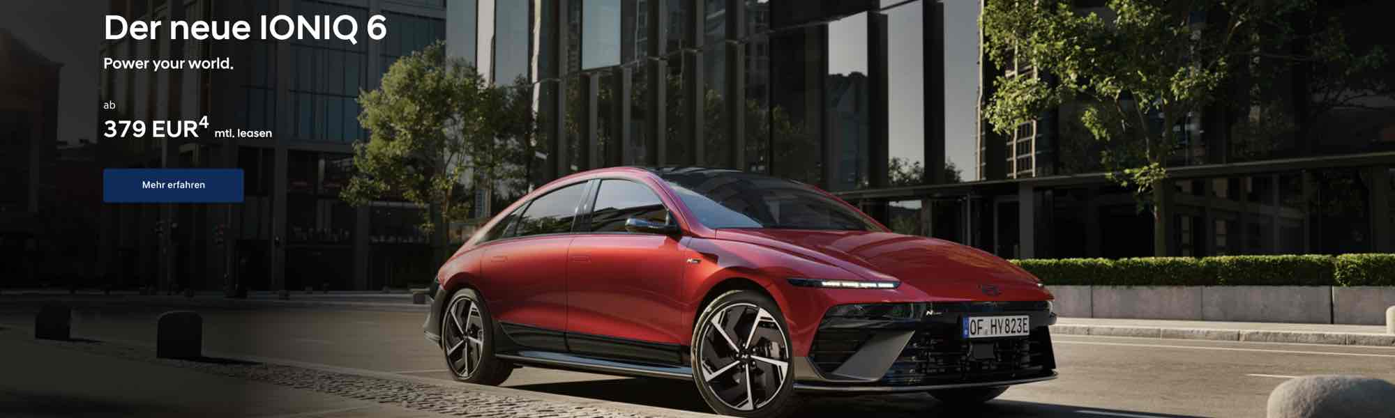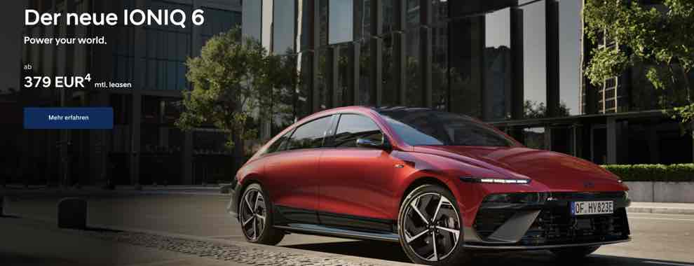 (4) Ein unverbindliches Leasingbeispiel der HYUNDAI Finance, ein Geschäftsbereich der Hyundai Capital Bank Europe GmbH, Europa-Allee 22, 60327 Frankfurt am Main. Verbraucher haben ein gesetzliches Widerrufsrecht. Nach den Leasingbedingungen besteht die Verpflichtung zum Abschluss einer Vollkaskoversicherung. Hyundai IONIQ 6 125 kW (170 PS) Batterie 63 kWh Heckantrieb, einmalige Leasingsonderzahlung 4.000,00 EUR, Laufzeit 48 Monate, Gesamtlaufleistung 40.000 km. Kostenpflichtige Zusatzausstattung möglich. Zuzüglich Überführungskosten. Alle Preise inkl. gesetzlicher MwSt. Angebot gültig bis 30.06.2026.